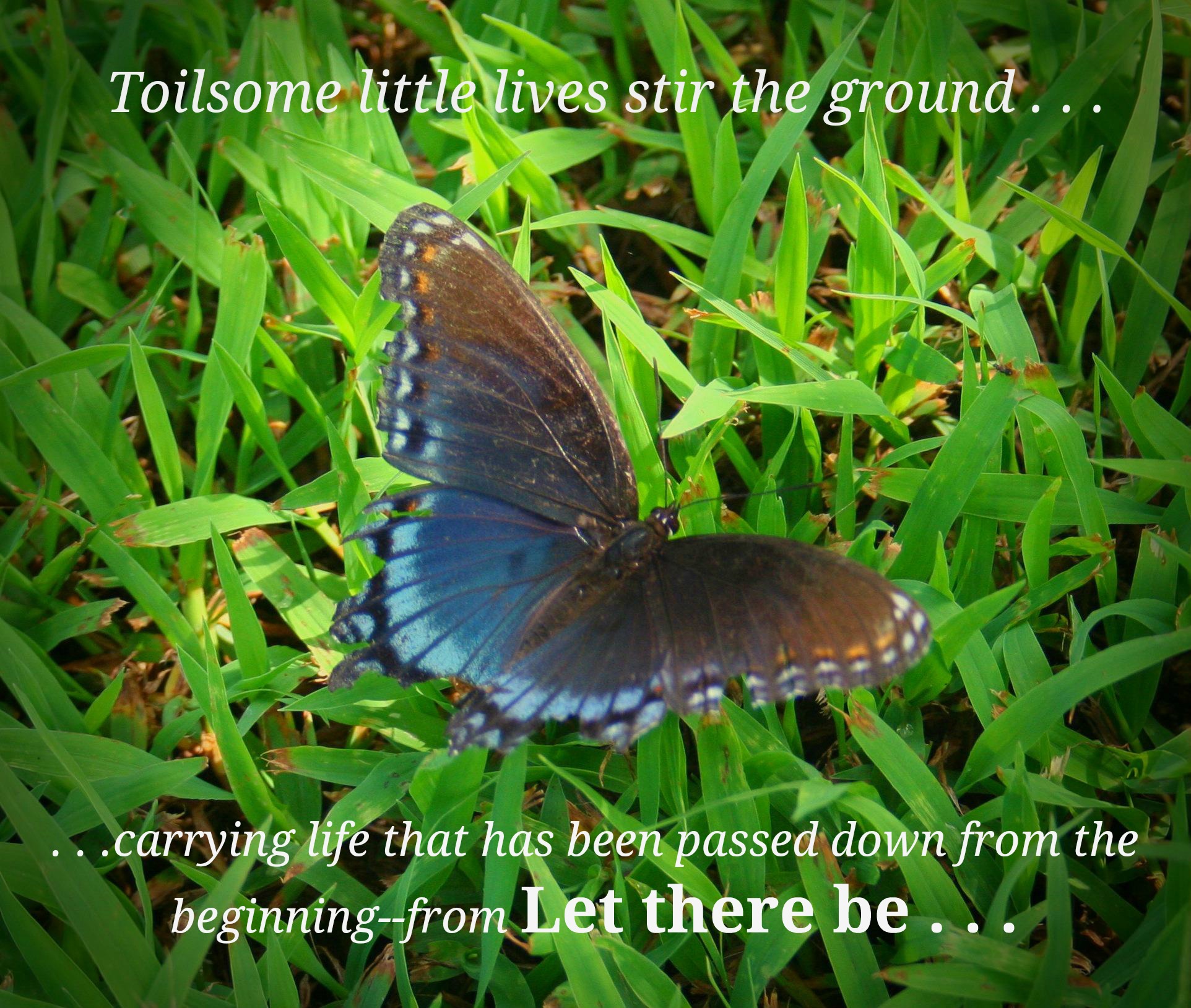 While absorbing the scene, I became preoccupied with a small butterfly, flitting and scrambling from one blade of grass to another, its flight a series of irregular heaves and tumbles. How tiny, I thought, I wonder where that little one will end up? As my gaze followed the butterfly across the yard, I saw that the grass was moving, but not because of a breeze. Countless bugs, large and small, made my yard their home. Their toilsome little lives stirred the ground almost imperceptibly, but taking in the yard all at once, the grass appeared to roll slightly like a wave. The neighborhood birds lighted on the branches of an oak tree next door, and my wide-eyed cat watched from the porch, twitching for an opportunity to give chase.